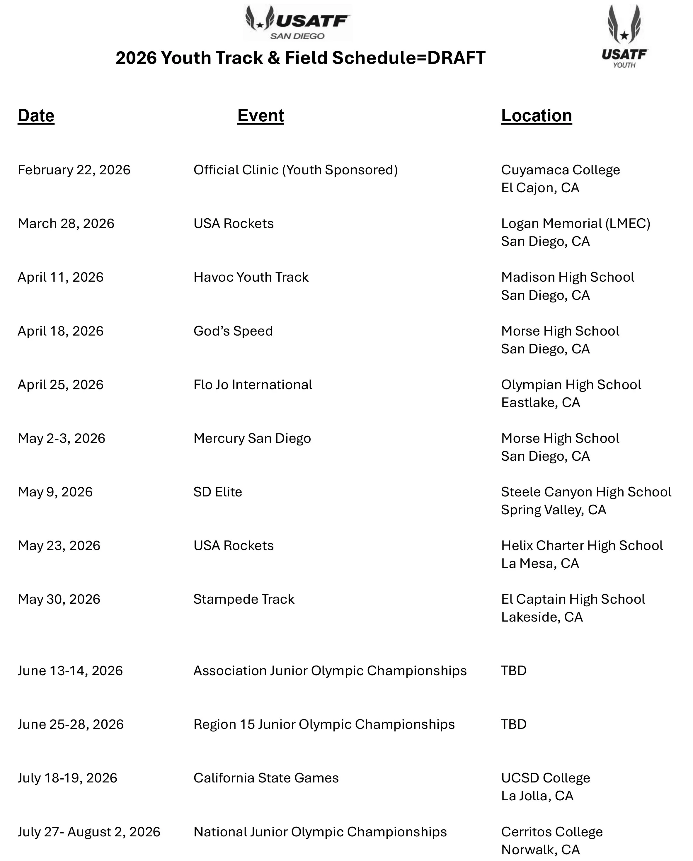 *All practices will take place at Cathedral Catholic High School